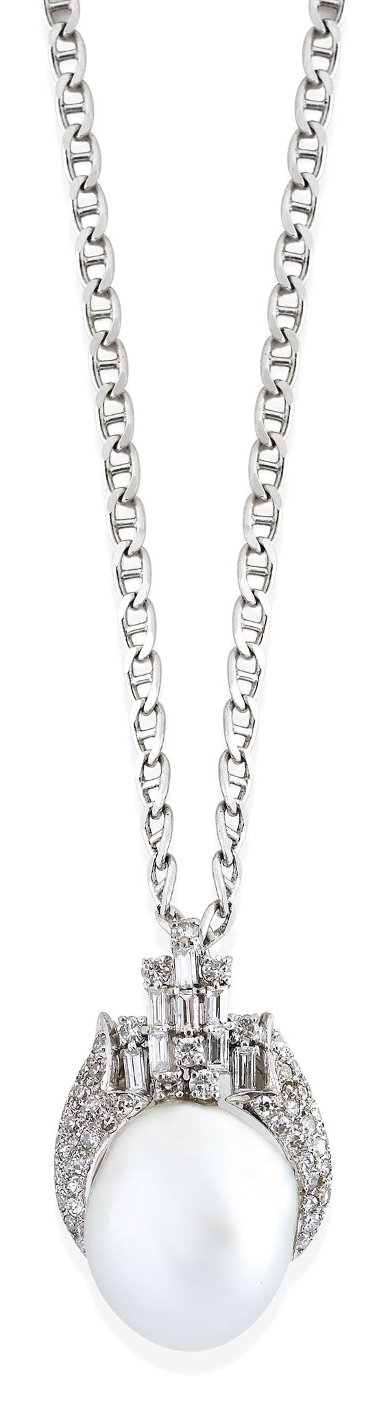 Comprising an oval baroque pearl of silver white hues, measuring 15.8mm by 13.6mm within a semi-circular bale set with round brilliant and baguette cut diamonds, suspended on a fancy link chain, in 14ct white gold.