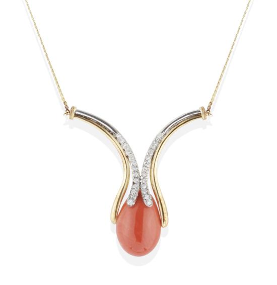 The teardrop shaped coral mounted within a curved 'V' shaped pendant set with single cut diamonds, on an integral snake chain, in two tone 14ct gold, total length 420mm.