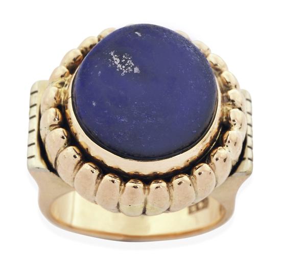 Centrally set with a lapis lazuli cut en cabochon, within a reeded gallery, in 14ct gold, ring size I-J.