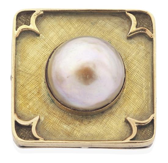 The square plaque with textured finish, centrally set with a mabe pearl of pink hues, in 18ct gold, ring size O-P.