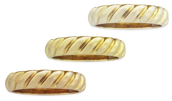 Comprising three individual reeded bands, in yellow, white and rose 18ct gold, ring size K-L.