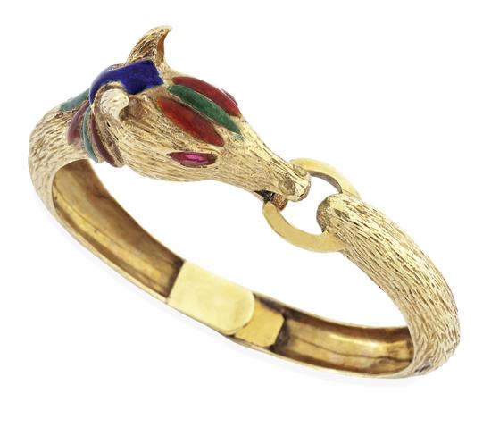 The hinged bangle depicting a mythical creature with enamel detail, in textured finish, in 14ct gold.