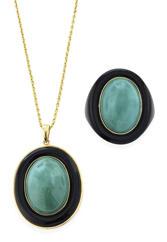 The ring comprising an oval turquoise cut en cabochon within an onyx surround, together with a pendant of conforming design, suspended on a fine chain, all in 18ct gold, ring size Q-R.