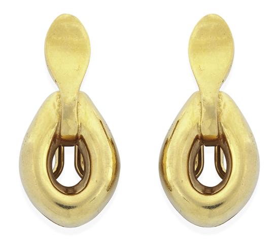 Of modern oval design in polished finish, to clip fittings, in 18ct gold.