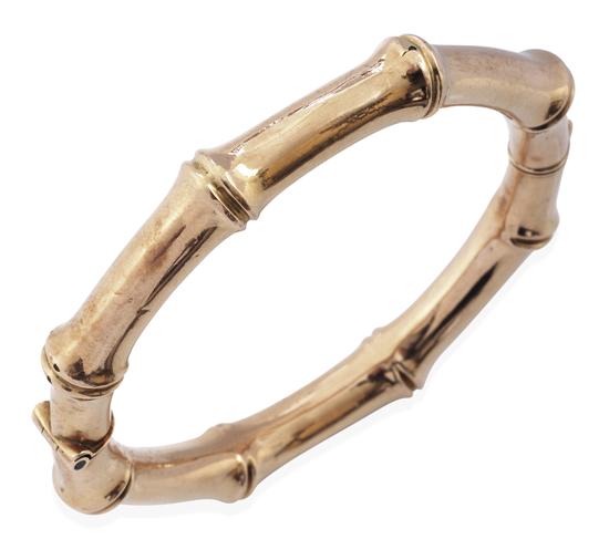 The hinged bangle of bamboo design, in 9ct rose gold, in original fitted box.