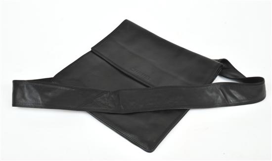 Styled in black leather and conforming shoulder strap, all with double top stitch detail, 27 x 28cm.
