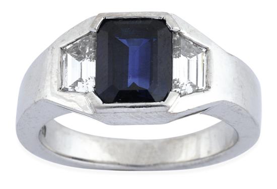 Centrally set with an emerald cut sapphire weighing 1.70cts, flanked by a trapezoid cut diamond to each shoulder, together totalling 0.65cts, in 18ct white gold, ring size L-M.