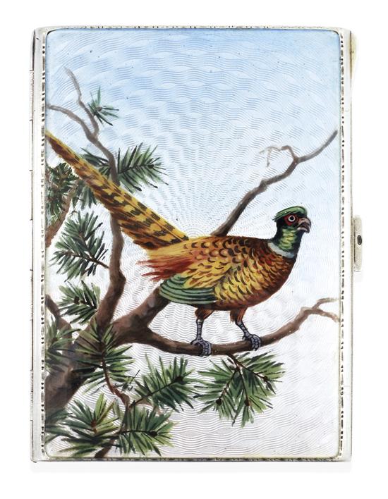 The rectangular case with hand painted pheasant on guilloche enamel and engine turned detail, in sterling silver.