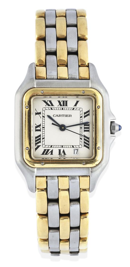 Quartz movement, square off white dial with Roman numerals, date aperture at five, signed case, dial and movement, stainless steel case with gold detail and conforming bracelet bands, case length 25mm.
