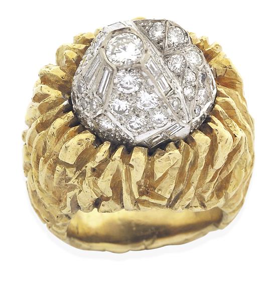 Centrally set with an abstract conical feature set with round brilliant and baguette cut diamonds, within a wide textured band, in 18ct gold, ring size K-L.