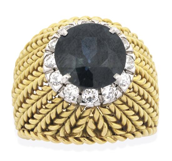 Of domed form, centrally set with a round sapphire weighing 5.0cts, within a border of round brilliant cut diamonds, in a wide mesh gallery and band, in 18ct gold, ring size L-M.