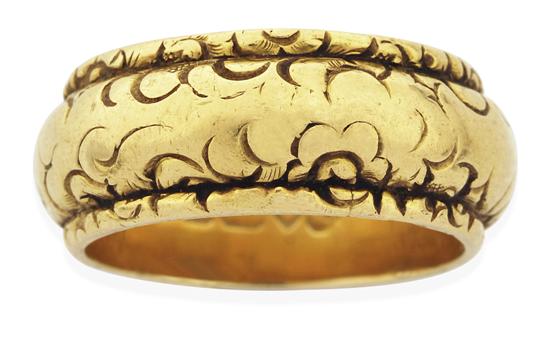 The wide domed wedding band with engraved decoration, in 22ct gold, ring size S-T, circa 1837.