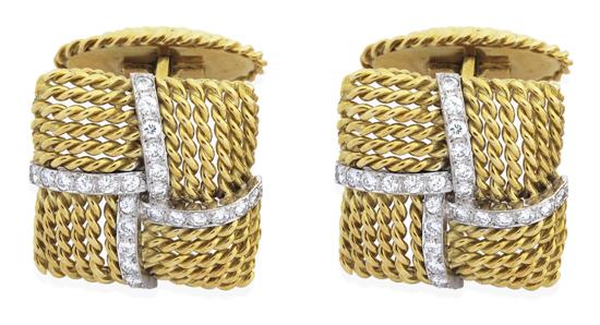 Of cushion shaped mesh design, with central 'X' feature of round brilliant cut diamonds, to swivel t-bar fittings, in 18ct gold.