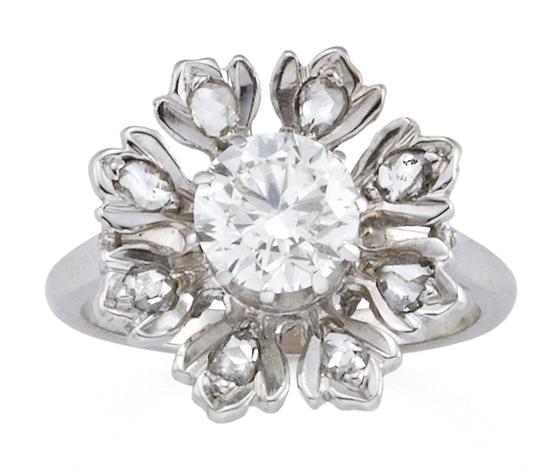 Of floral design, centrally set with a round brilliant cut diamond weighing 1.15cts, within stylized petals, each set with a rose cut diamond, in rhodium plated 18ct yellow gold, ring size L-M.