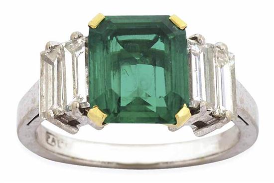 Centrally set with an emerald cut emerald weighing 2.56cts, flanked by two baguette cut diamonds to either side, totalling 1.40cts, in 18ct two tone gold, independent valuation available, ring size J-K.