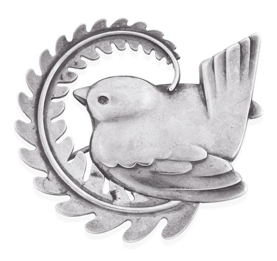Designed by Arno Malinowski, styled as a bird within a foliate surround, in sterling silver, the brooch also bears the Georg Jensen Ltd mark G.J. Limited and import mark for London 1959-1960, reference 309.