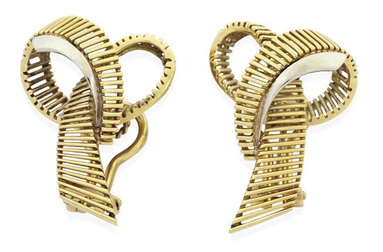 The stylised bows, to clip fittings, in two tone 14ct gold.