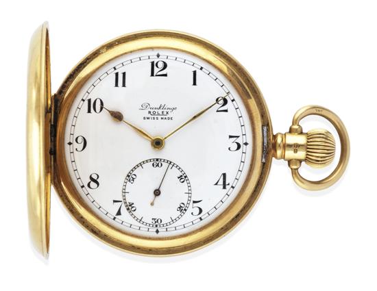 Crown wind movement, full hunter, circular white enamel dial with black painted Arabic numerals, 18ct gold case with engraved initials, hallmarked Birmingham 1925, retailed by Dunklings, 50mm diameter.