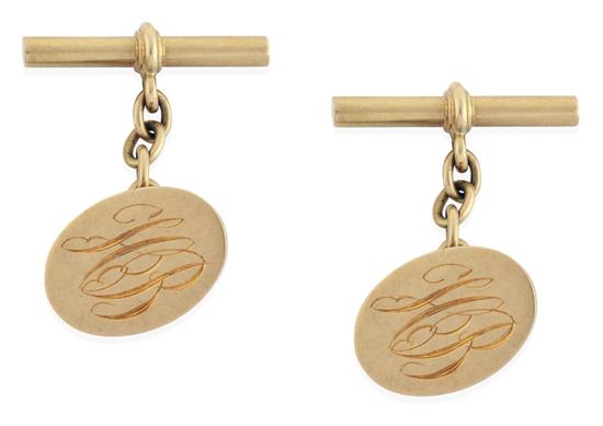 Each oval plaque engraved with initials 'SCB', to chain and t-bar fittings, in 15ct gold, by Dunklings.