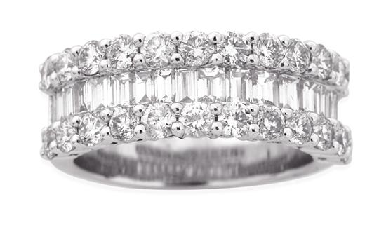 Comprising a central row of baguette cut diamonds between a row of round brilliant cut diamonds to each side, altogether totalling 2.47cts, in 18ct white gold, ring size M-N.