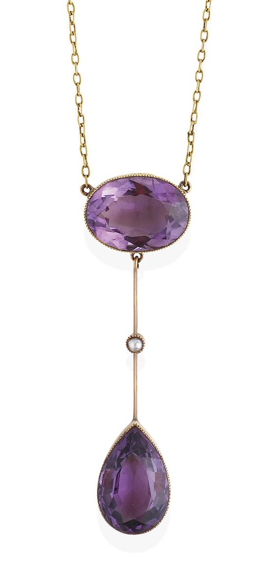Comprising an oval amethyst suspending a pear cut amethyst on a knife edge bar with seed pearl detail, on a fine trace chain in 15ct gold, total length 380mm.