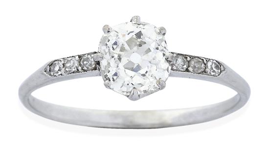 Centrally set with an old oval cut diamond weighing 1.38cts, in an eight claw setting with diamond set shoulders, in 18ct white gold, ring size S-T.
