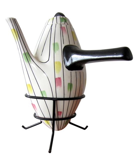A SALINS CERAMIC COFFEE POT ON METAL STAND