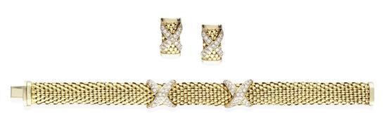 Comprising a mesh link bracelet with applied diamond set crossover design, total weight 37.0gms, total length 190mm, together with a pair of earrings of conforming design, to post and clip fittings, in 14ct gold.
