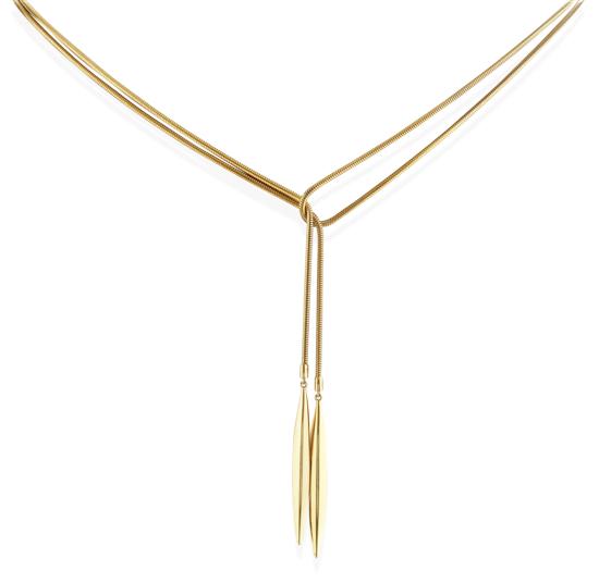 From the 'Feathers' range, the snake link chain terminated to each end by a pointed drop pendant, in 18ct gold, total weight 30gms, total length 1320mm, with original box.