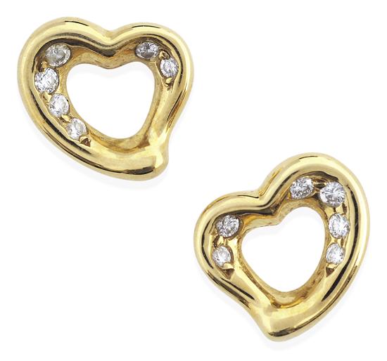 Designed by Elsa Peretti, the heart shaped earrings set with diamonds, to post and butterfly fittings, in 18ct gold.