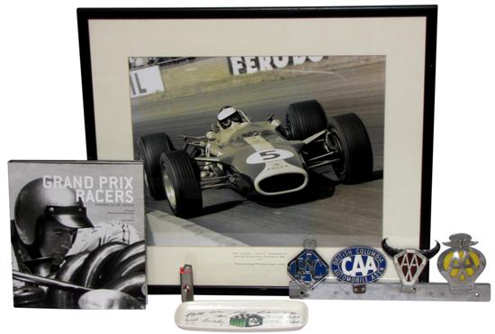 including car club badge rack, Michael Cooper Evans photographic print of Jim Clark in Lotus Cosworth, British GP 1967, Stavangerflint 1960s 'Dog House Club' ceramic dish, Borgward cigarette lighter and Grand Prix Racers book