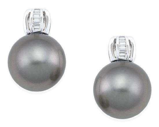 A PAIR OF TAHITIAN PEARL AND DIAMOND EARRINGS