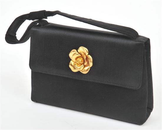 Styled in black satin with single short carry handle, finished with a gold metal camellia clasp to front, serial number 5472521,19 x 13 x 5cm, boxed.