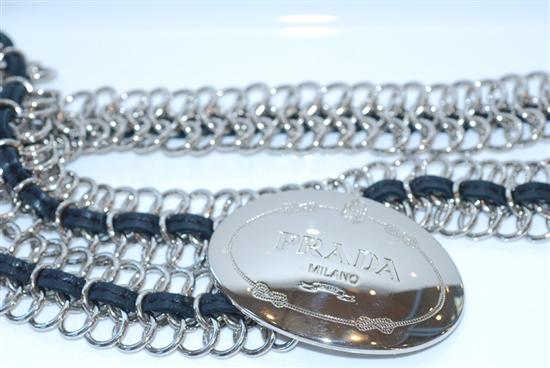 A BELT BY PRADA - Styled in silver metal, the fancy link chain belt with black woven leather trim, to a signed oval buckle, total length 85cm.