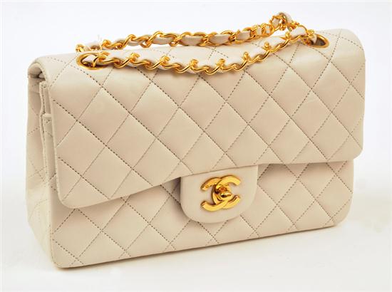 Styled in quilted white lambskin with gold metal clasp and conforming woven leather chain strap, 23 x 16cm.
