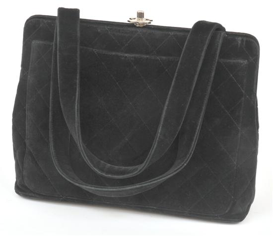 Styled in quilted black velvet with conforming straps and silver metal clasp, serial number 4449890, 31 x 23 x 13cm.