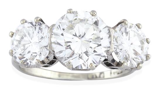 Centrally set with a round brilliant cut diamond weighing 2.50cts, flanked by a diamond to each side, together totalling 2.25cts, in 18ct white gold, independent valuation available, ring size M-N.