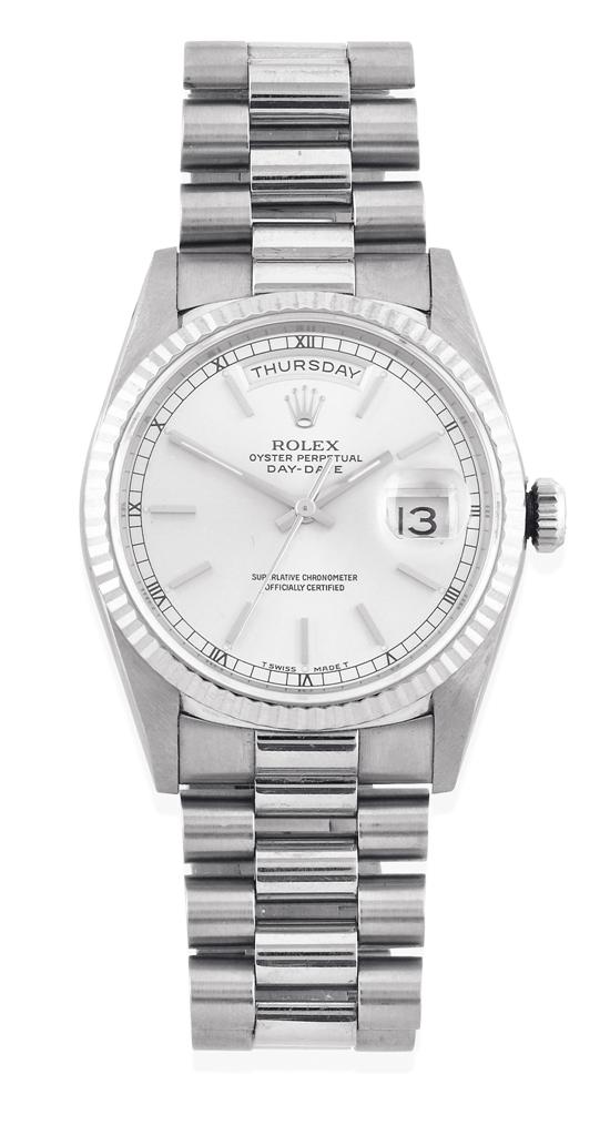 Automatic movement, circular silvered dial with raised baton numerals, date aperture at three, day aperture at twelve, signed case, dial and movement, 18ct white gold case and conforming bracelet bands, 35mm diameter, with box .