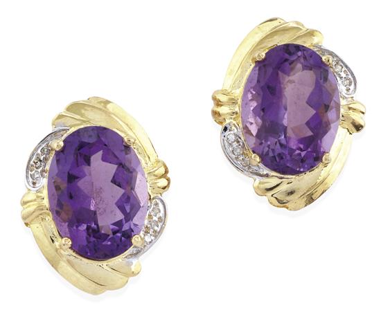 Each earring set with an oval amethyst weighing 8.0cts, within a diamond set decorative border, to post and clip fittings, in 14ct gold.