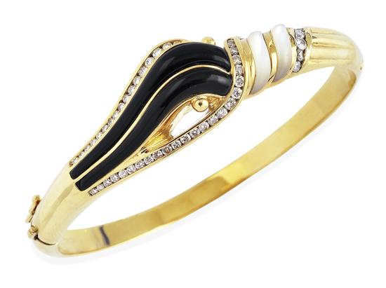 The hinged bangle with onyx, mother of pearl and diamond detail, in 18ct gold.