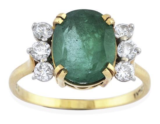 Centrally set with an oval emerald weighing 4.50cts, flanked by three round brilliant cut diamonds to either side, in 18ct gold, ring size U-V.