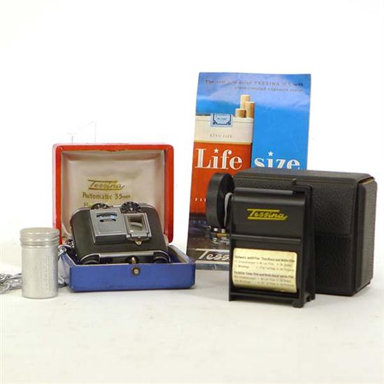 CONCAVA S.A. TESSINA 35MM MODEL L, BLACK WITH CROSS COUPLED EXPOSURE METER, PAMPHLET, AND TESSINA DAYLIGHT SELF-LOADER, BOTH BOXED (3)