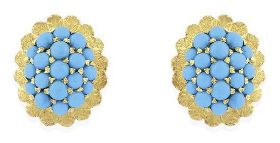 Each earring comprising a central cluster of turquoise within a border of etched leaves, to clip fittings, in 18ct gold.