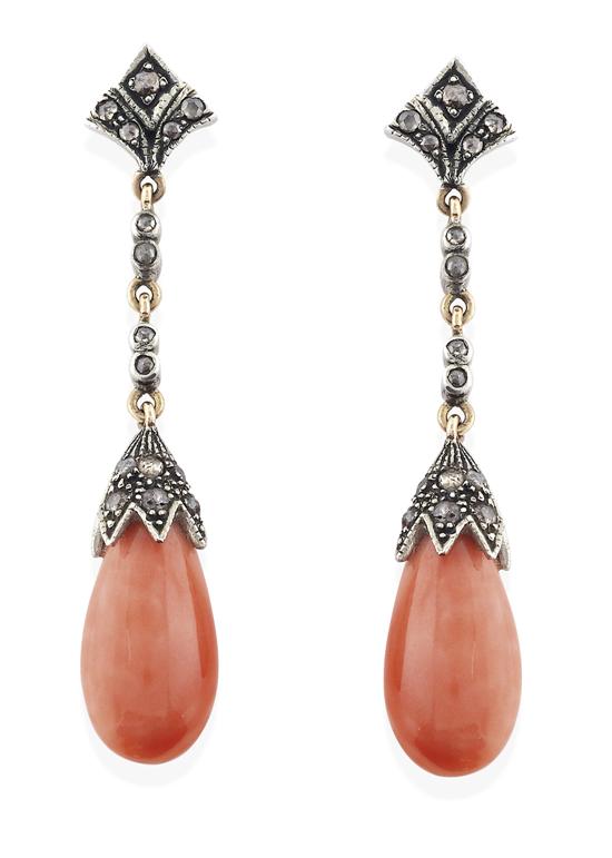 Each earring comprising a teardrop shaped coral with diamond set cap suspended below a vertical diamond set drop and stud fitting, in 9ct gold and silver.