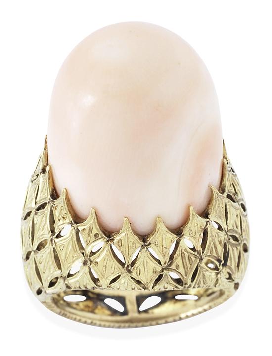 The elongated domed coral set within a wide pierced gallery and band in textured finish, in 14ct gold, ring size K-L.