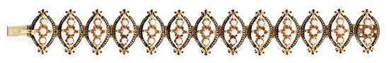 Comprising open elliptical shaped links, each with three central claw set opals within a detailed enamelled border, in 14ct gold, total length 175mm.