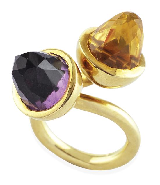 Of modern crossover design, with 'acorn' terminals set with a single fancy cut amethyst and citrine, in 18ct gold, ring size K-L.
