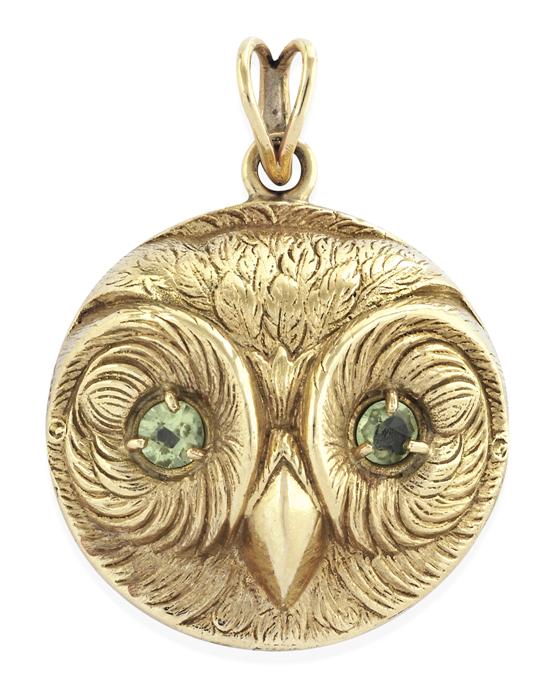 The finely carved owl pendant with peridot set eyes, in 14ct gold.