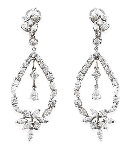 Each earring comprising an open teardrop shaped frame set with round brilliant and marquise cut diamonds, with a central articulated diamond set drop, to diamond set post and clip fittings, in 18ct white gold.