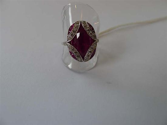AN ART DECO STYLE SYNTHETIC RUBY AND DIAMOND RING - The oval plaque set with fancy cut rubies, with applied geometric diamond detail, in 18ct white gold, ring size M-N.